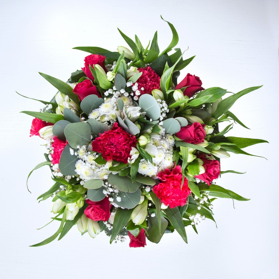 Experience the art of floral design with our Blossom of Distinction bouquet. This stunning arrangement features immaculate white chrysanthemums, delicate gypsophila, and the vibrant allure of red roses, interwoven with the soft elegance of carnations. The ensemble is completed with graceful white alstroemeria and verdant aspidistra leaves for a look that is both modern and timeless.
