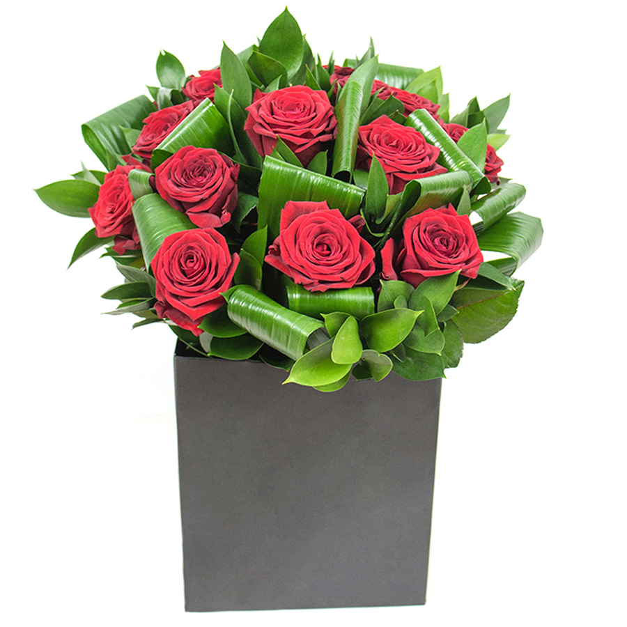 Embrace the timeless elegance of our exquisite bouquet, artfully combining rich red roses, vibrant aspidistra leaves, and lush ruscus. This unique arrangement is perfect for adding a touch of sophistication to any space.