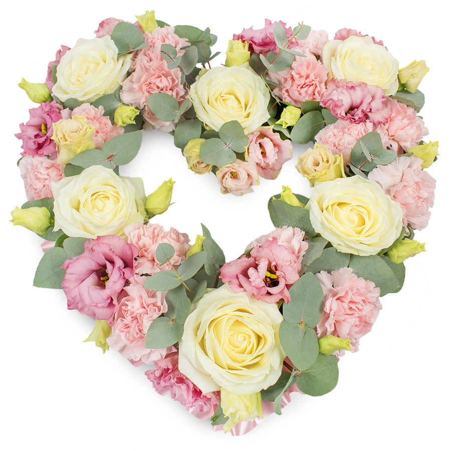Show your respect and love with our Refined Open Heart Tribute Bouquet. This sophisticated arrangement features a stunning combination of white roses, pink carnations, pink lisianthus, and Eucalyptus leaves, elegantly arranged in an open heart shape to symbolize enduring love and remembrance.